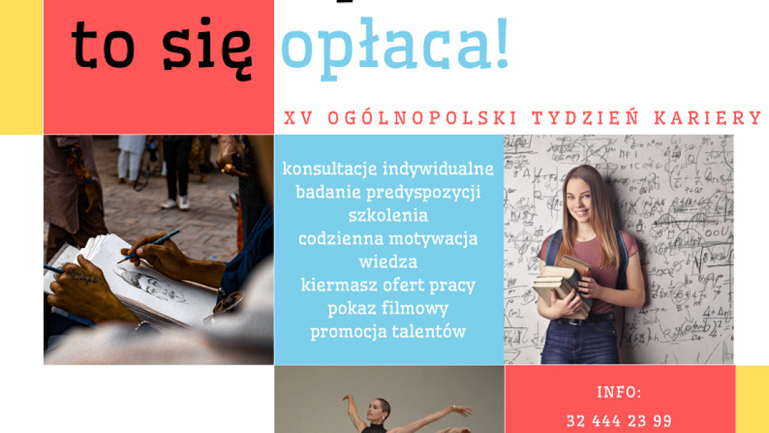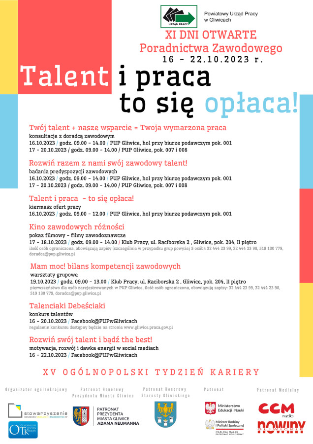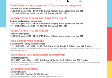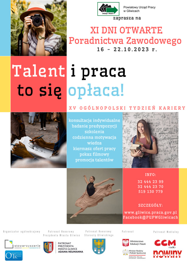Tegoroczne hasło wydarzenia to „Talent i praca – to się opłaca!”. Promocja talentów i rozwoju osobistego na rynku pracy będzie naszym tematem przewodnim w dniach 16 – 22.10.2023 r. Zapraszamy wszystkich mieszkańców Gliwic i powiatu gliwickiego do kontaktu z naszymi doradcami zawodowymi i śledzenia kanałów w mediach społecznościowych w celu poszukiwania inspiracji do własnego rozwoju.