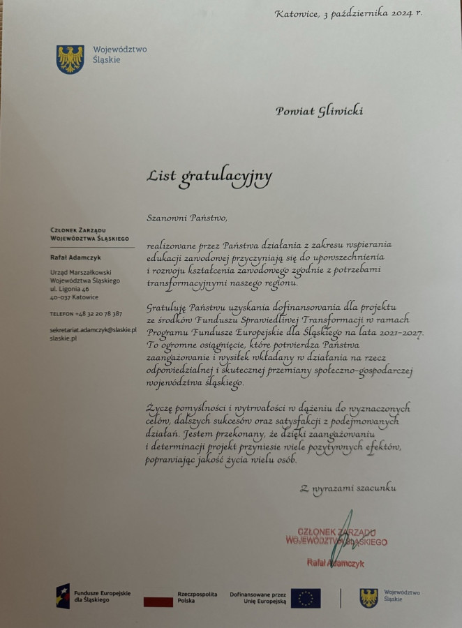 „Kształcenie zawodowe w Powiecie Gliwickim zgodne z potrzebami transformacji regionu”
