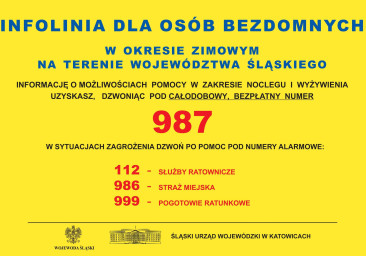 obowiązku odśnieżania i usuwania nawisów lodowych i śnieżnych przez właścicieli i administratorów budynków.Jednocześnie przypominamy, że od dnia 1 listopada 2024 r. do dnia 31 marca 2025 r. w Śląskim Urzędzie Wojewódzkim w Katowicach funkcjonuje bezpłatna, całodobowa infolinia dla osób bezdomnych pod nr
