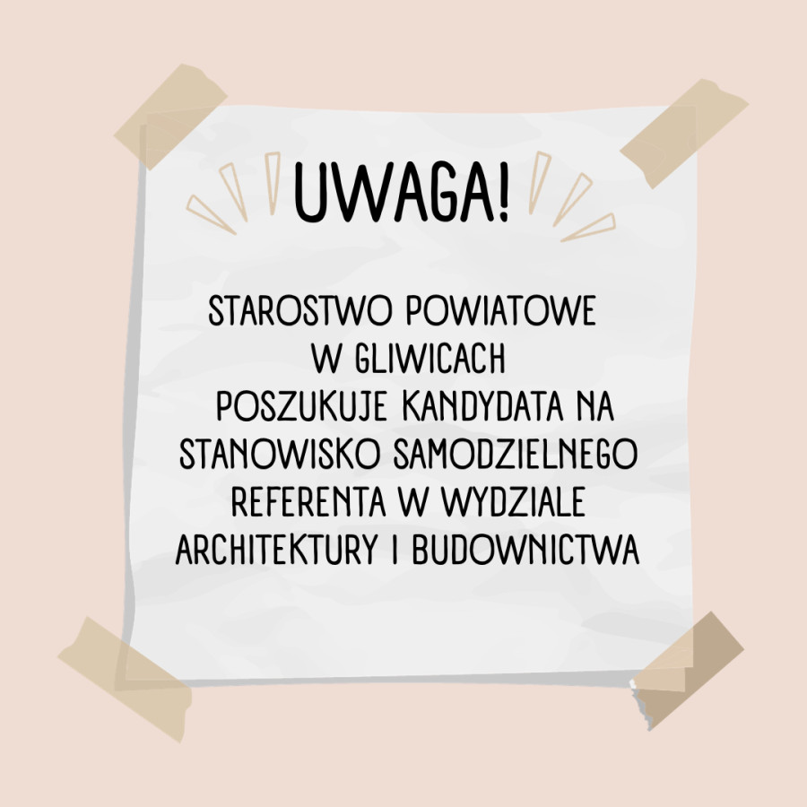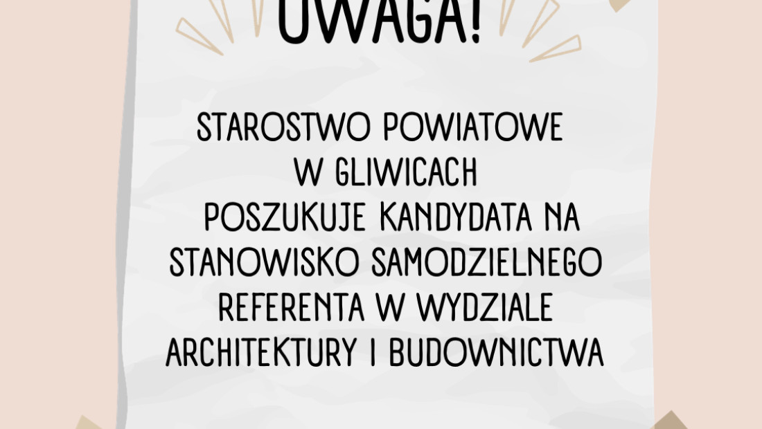 Starostwo Powiatowe w Gliwicach poszukuje kandydata na stanowisko samodzielnego referenta w Wydziale Architektury i Budownictwa.